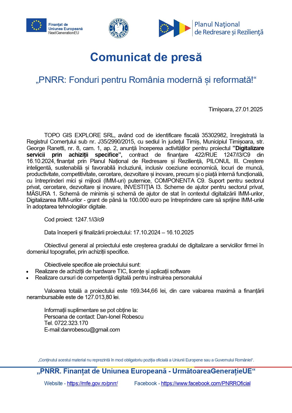 Actualitate Comunicat de presă „PNRR: Fonduri pentru România modernă și reformată!“ Integral Design Actualitate 27 Ianuarie 2025 Whatsapp